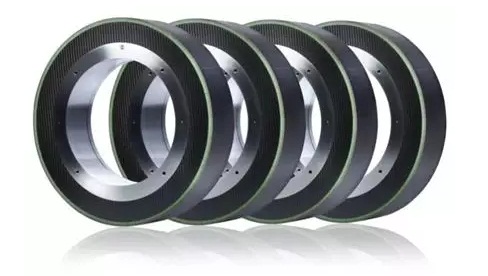 對于這些有高性能要求的磨削應(yīng)用,使用自重輕的復(fù)合纖維基體是一個解決方案。這些碳纖維復(fù)合材料的優(yōu)點是高比強度和低密度相結(jié)合,相對于鋼基體,完美解決了砂輪基體過重的弊端。碳纖維基體的CBN砂輪(見下圖)已經(jīng)廣泛應(yīng)用于各種曲軸加工或齒輪軸加工,當(dāng)客戶需要大直徑的砂輪,或者需要使用多個平行砂輪組合拼裝使用時,例如無心磨工藝,碳纖維基體的CBN砂輪就會是一個優(yōu)選方案。