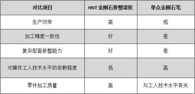 具體金剛石滾輪修整器相比金剛石筆的優(yōu)勢(shì)如下表: