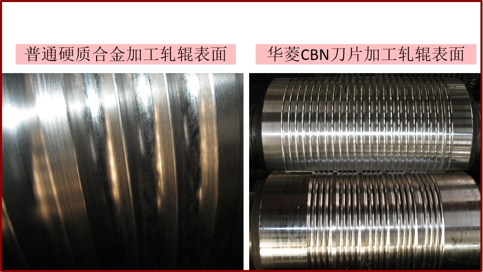首先,我們可以直觀地觀察到華菱CBN刀片與普通硬質合金刀片相比,在加工軋輥表面時效果非常明顯,極大地提高了軋輥表面的質量。