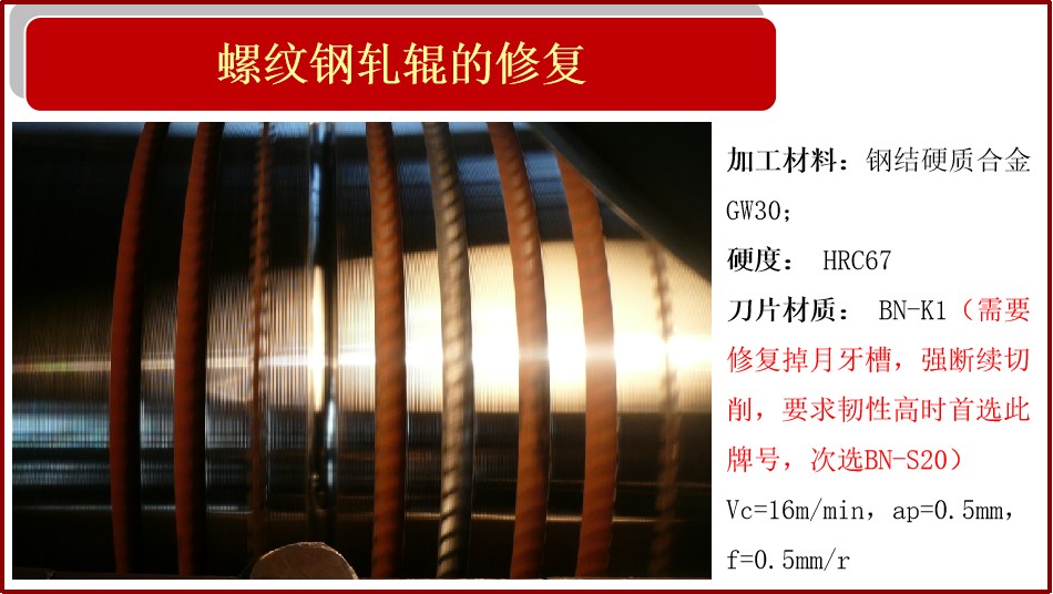 另外,還有華菱CBN刀具BN-K1系列修復螺紋鋼軋輥的車削案例,該軋輥硬度達到HRC67。使用華菱CBN刀具后,效率是某知名合金刀具的5倍,耐用度是其4倍。
