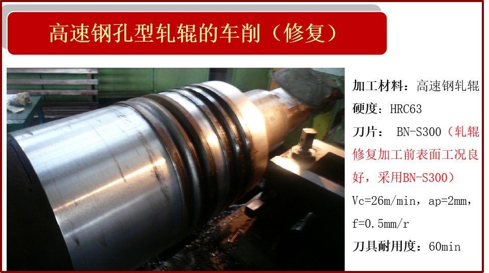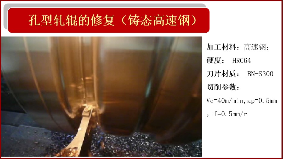 最后,還有華菱CBN刀具BN-S300系列修復孔型軋輥的車削案例,該軋輥材質為高速鋼,硬度達到HRC64。使用華菱CBN刀具后,效率比某知名品牌陶瓷刀具高出50%,耐用度是其4倍。