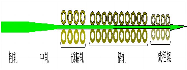 初中軋機(jī)一般有12至14架軋輥,大部分使用鑄鐵軋輥,最后兩架軋輥可能采用硬質(zhì)合金復(fù)合軋輥。預(yù)精軋機(jī)一般有2至4架軋輥,大部分使用硬質(zhì)合金輥環(huán)。精軋機(jī)一般有10架軋輥,全部采用碳化鎢輥環(huán)進(jìn)行微張力的軋制。
