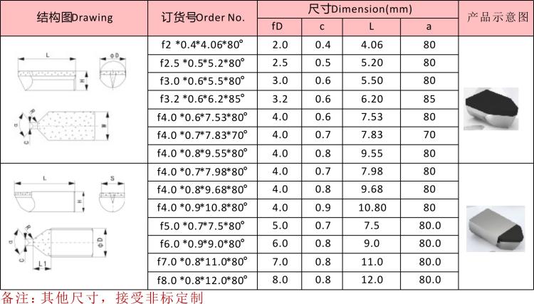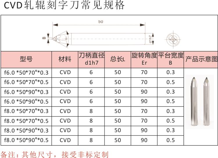 這個是華菱針對硬質(zhì)合金軋輥加工研發(fā)的常用PCD旋銑刀、旋刻刀桿和CVD刻字刀常用的規(guī)格型號如下表格,大家有需要的可以截圖保存,其中CVD刻字刀常見的兩個規(guī)格是φ6.0*50*70°*0.3;φ8*50*70°*0.5/0.6,根據(jù)華菱多年總結(jié)經(jīng)驗,轉(zhuǎn)速一般是機(jī)床固定轉(zhuǎn)速2800轉(zhuǎn);ap=0.5-1.0 (扎刀深度在0.5-1.0);進(jìn)給(Fr)一般根據(jù)用戶加工軋輥的硬度進(jìn)行調(diào)整,硬度越高,進(jìn)給量越取小值。華菱PCD旋銑刀和CVD刻字刀都屬于定制產(chǎn)品,可根據(jù)客戶需求進(jìn)行尺寸定制。