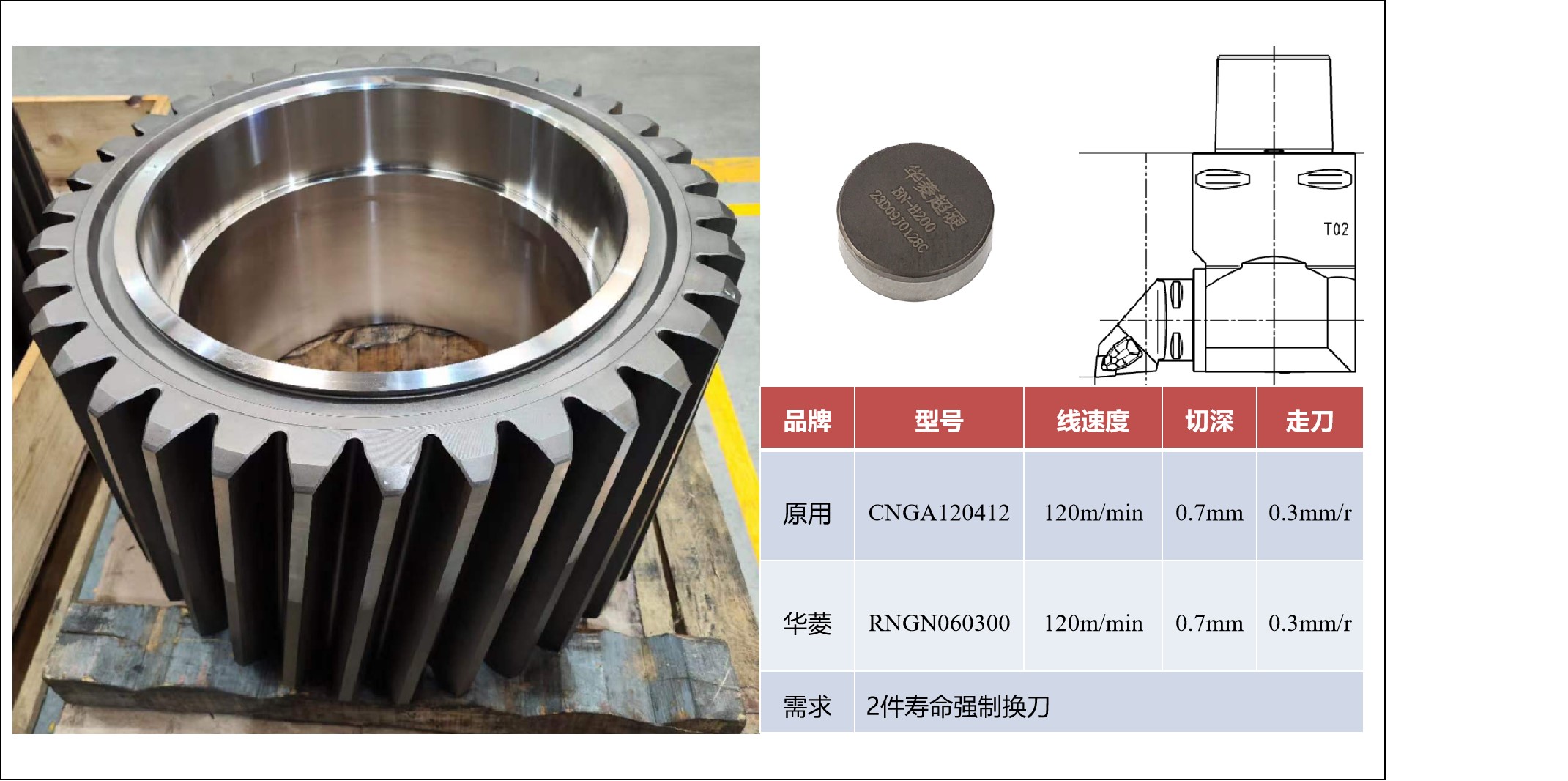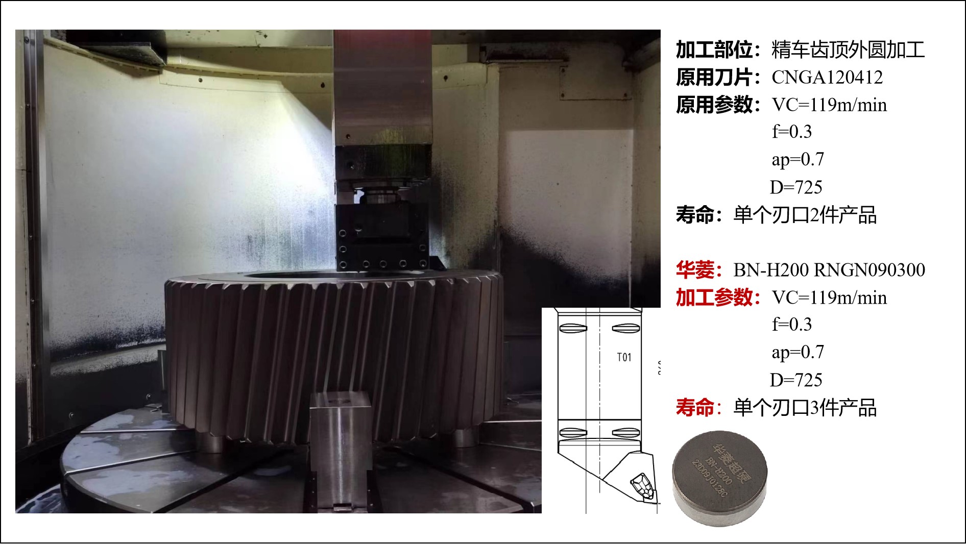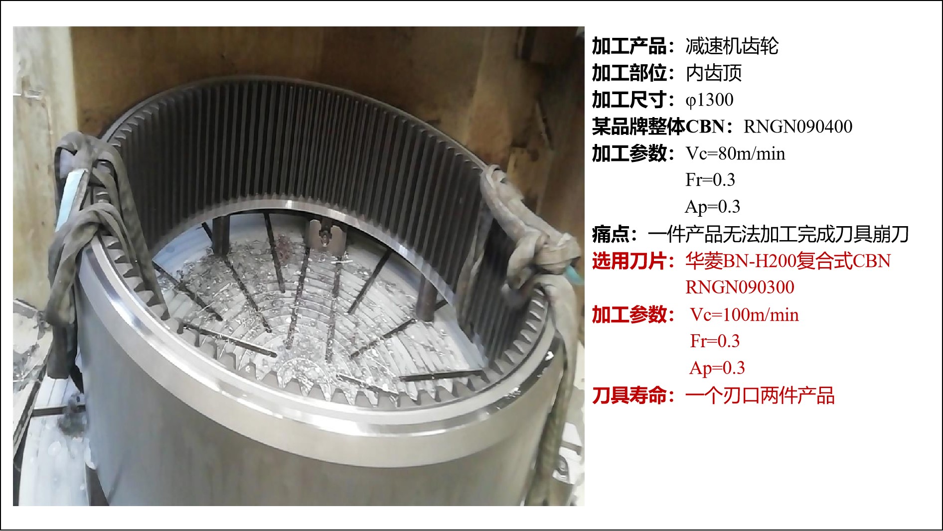 (1)風(fēng)電齒輪外圈加工案例:加工的產(chǎn)品是風(fēng)電減速機(jī)齒輪的內(nèi)齒頂,直徑達(dá)到1300mm。工件尺寸很大,客戶原來使用的其他品牌的整體RNGN090400的CBN刀片,不僅導(dǎo)致崩刀問題,而且一件產(chǎn)品無法加工完成。華菱推薦使用BN-H200復(fù)合式RNGN090300的CBN刀片,并調(diào)整加工參數(shù)后,驚喜地發(fā)現(xiàn),一個(gè)刃口可以至少加工兩件產(chǎn)品!